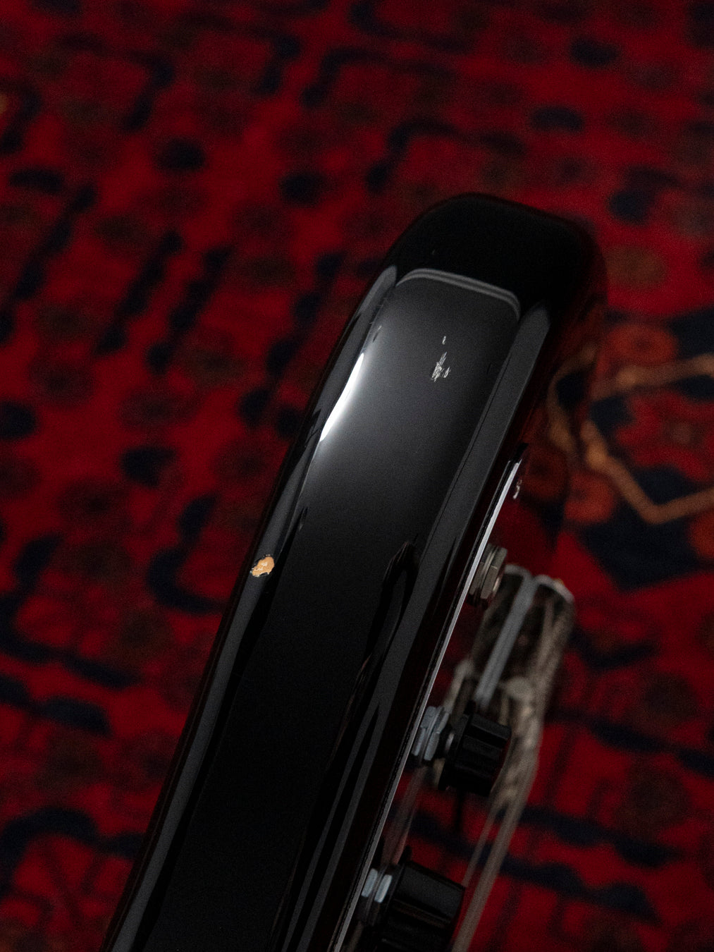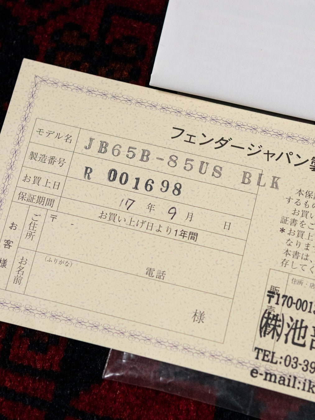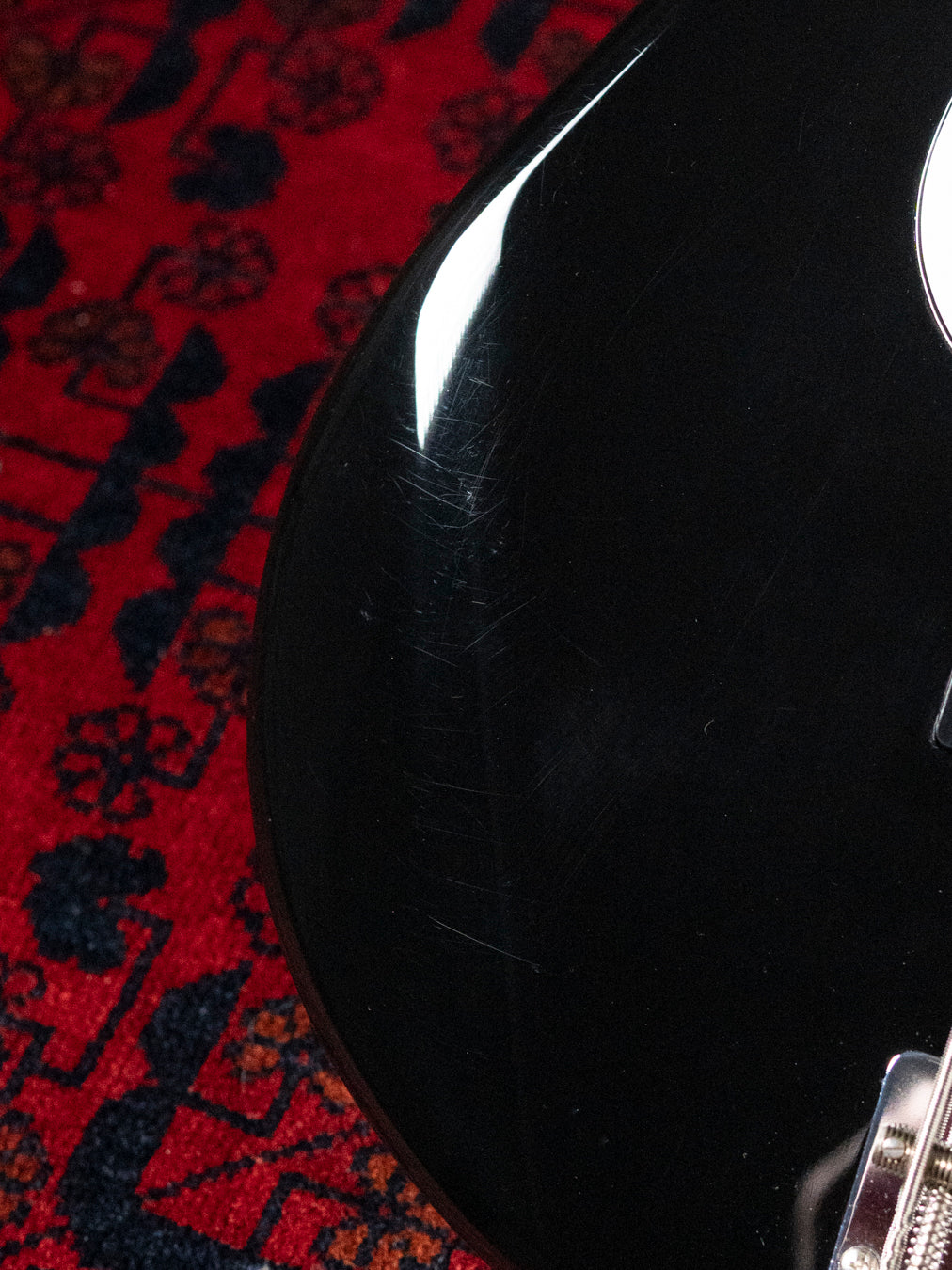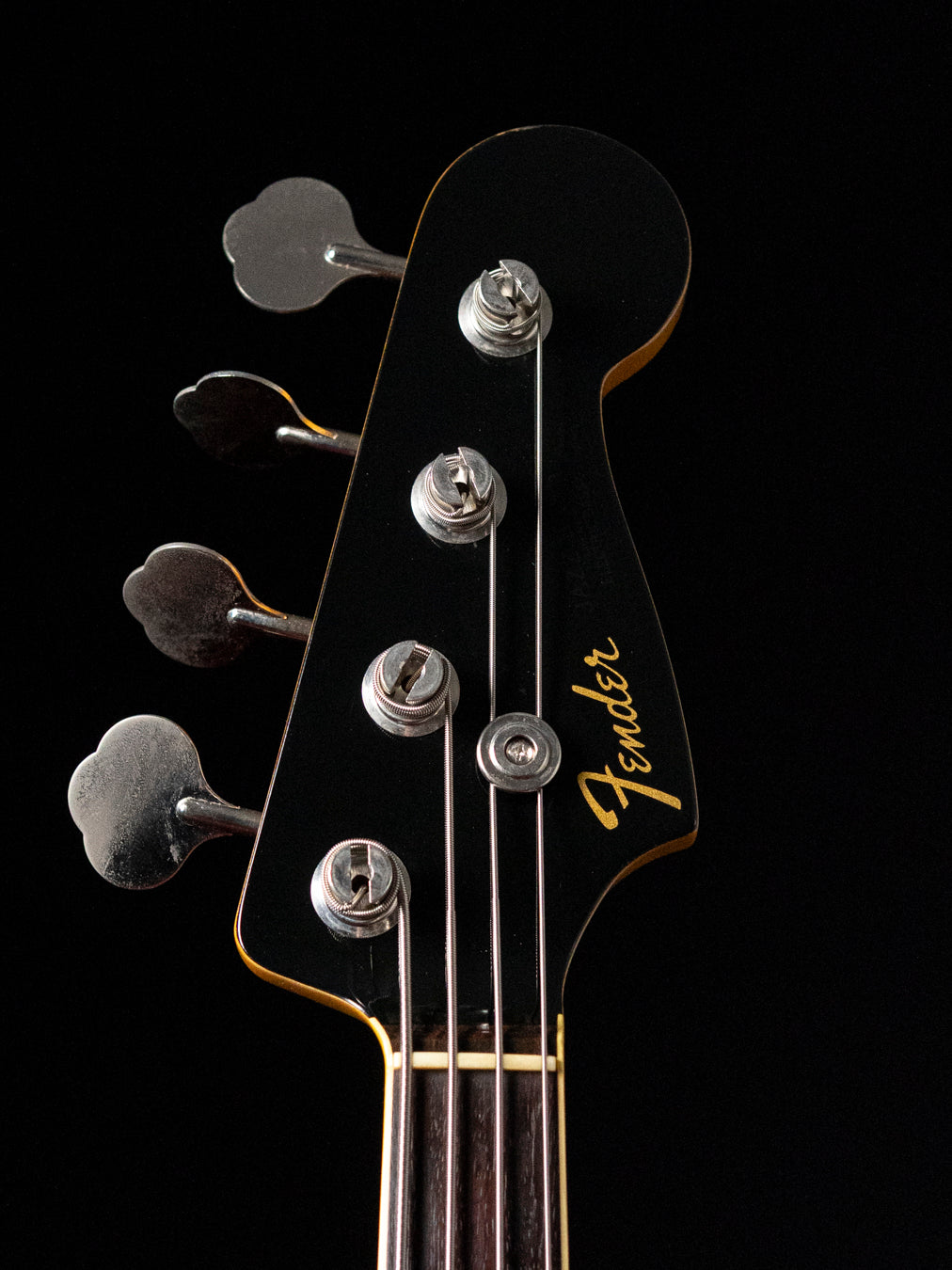 2005 Fender Japan JB65B-85US '65 Jazz Bass in Black (BLK) finish with matching headstock and factory USA Vintage pickups. Produced from 2005–2009, and replaced in the catalog lineup by the JB66B (blocks instead of dots) in 2010.