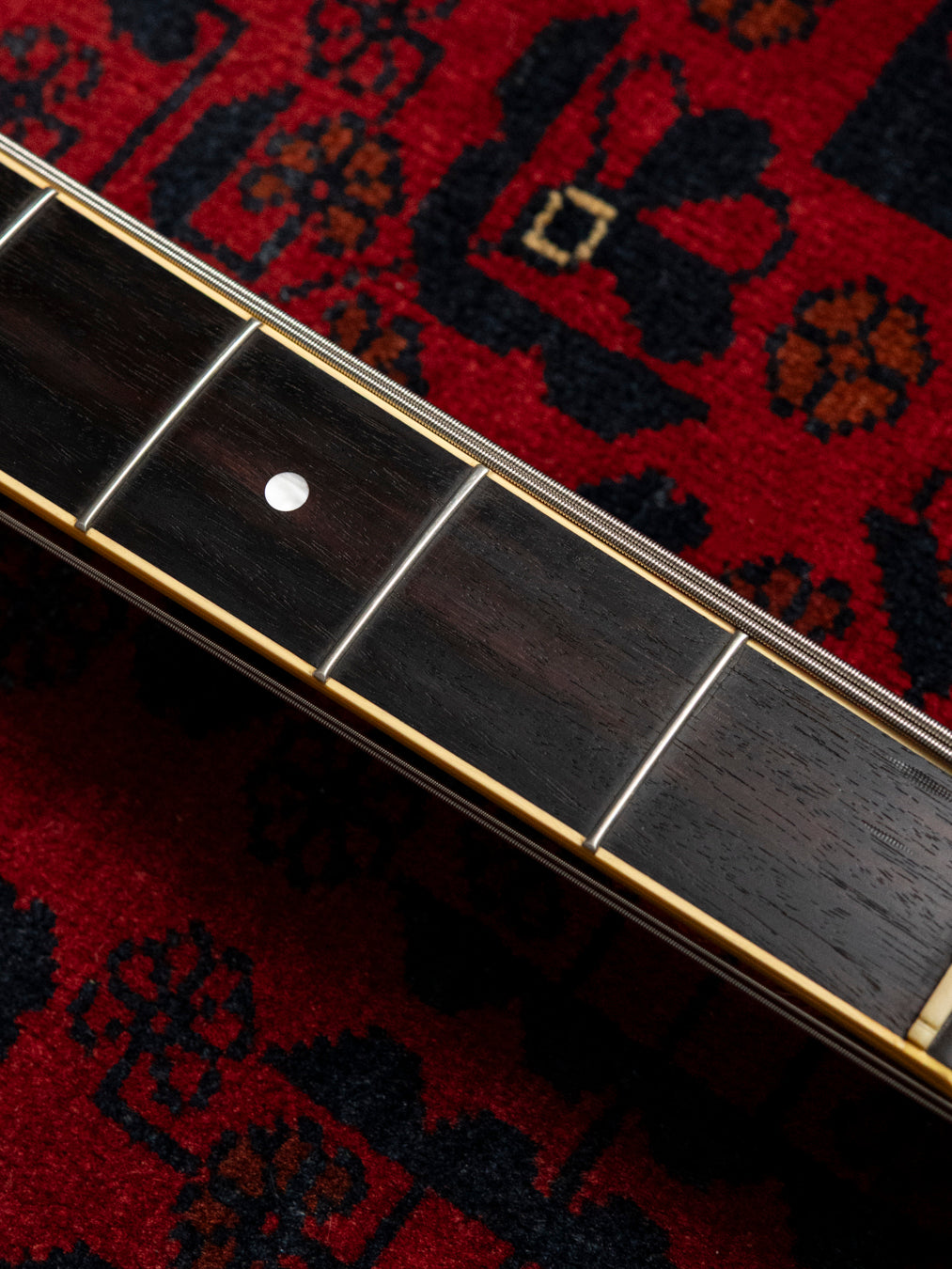 Set up with D'Addario 45-100 strings, playing up and down the neck with proper intonation.